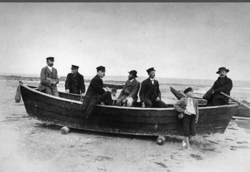 En grupp män sitter i en båt, upplagd på stranden i Mellbystrand